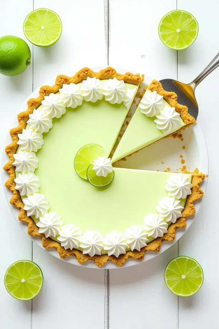 - Remove pie from refrigerator 5-10 minutes before serving to take slight chill off (optimal serving temperature is cold but not icy). Spread whipped cream over filling with offset spatula, creating soft peaks and swirls, or pipe decorative rosettes using a piping bag with star tip. Alternatively, serve whipped cream on the side and let guests add their own. Garnish with thin lime slices, lime zest curls, or fresh mint leaves for visual appeal. For clean slices, wipe knife with hot water and dry between cuts.Presentation note: Classic key lime pie showcases the pale filling with simple white cream and green lime garnish let the natural colors shine.