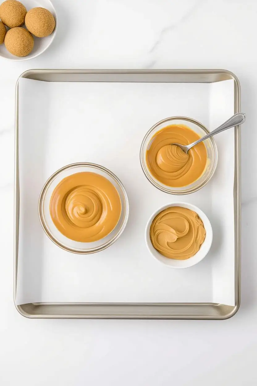 - Line a large baking sheet or plate with parchment paper and set aside. Ensure your peanut butter is at room temperature—if it's cold from the fridge, microwave for 15-20 seconds and stir until smooth. Cold peanut butter creates lumpy, difficult-to-mix dough.Success Indicator: Peanut butter should be easily stirrable and flow slowly off a spoon.