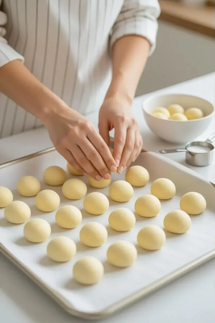 - Using a tablespoon measure or 30g cookie scoop, portion the dough into equal amounts. Roll each portion between your palms using gentle but firm pressure, creating smooth spheres about 2.5cm (1 inch) in diameter. If dough sticks to your hands, lightly dampen palms with water or neutral oil.Rolling Technique: Use circular motion with moderate pressure—too light and balls won't compact; too firm and natural oils will release, making them greasy.Yield Check: You should get 18-20 uniform balls from this recipe. If yield is significantly different, recheck measurements.
