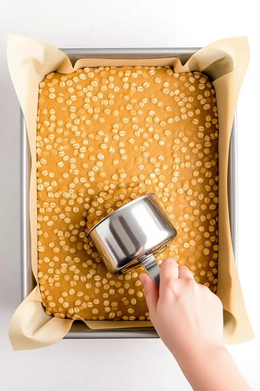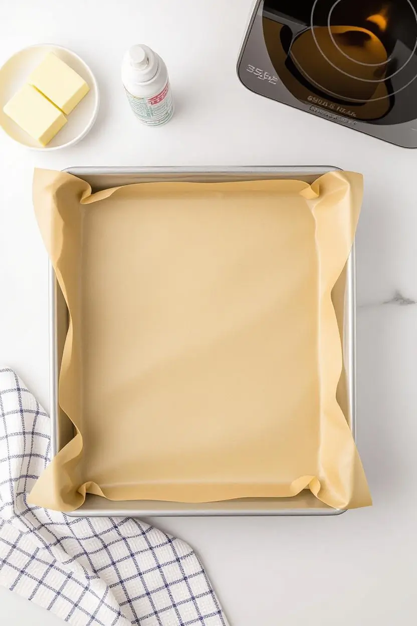 - Preheat oven to 350°F (175°C). Line an 8×8-inch baking pan with parchment paper, leaving overhang for easy removal. Lightly grease parchment with butter or cooking spray to prevent any sticking.
