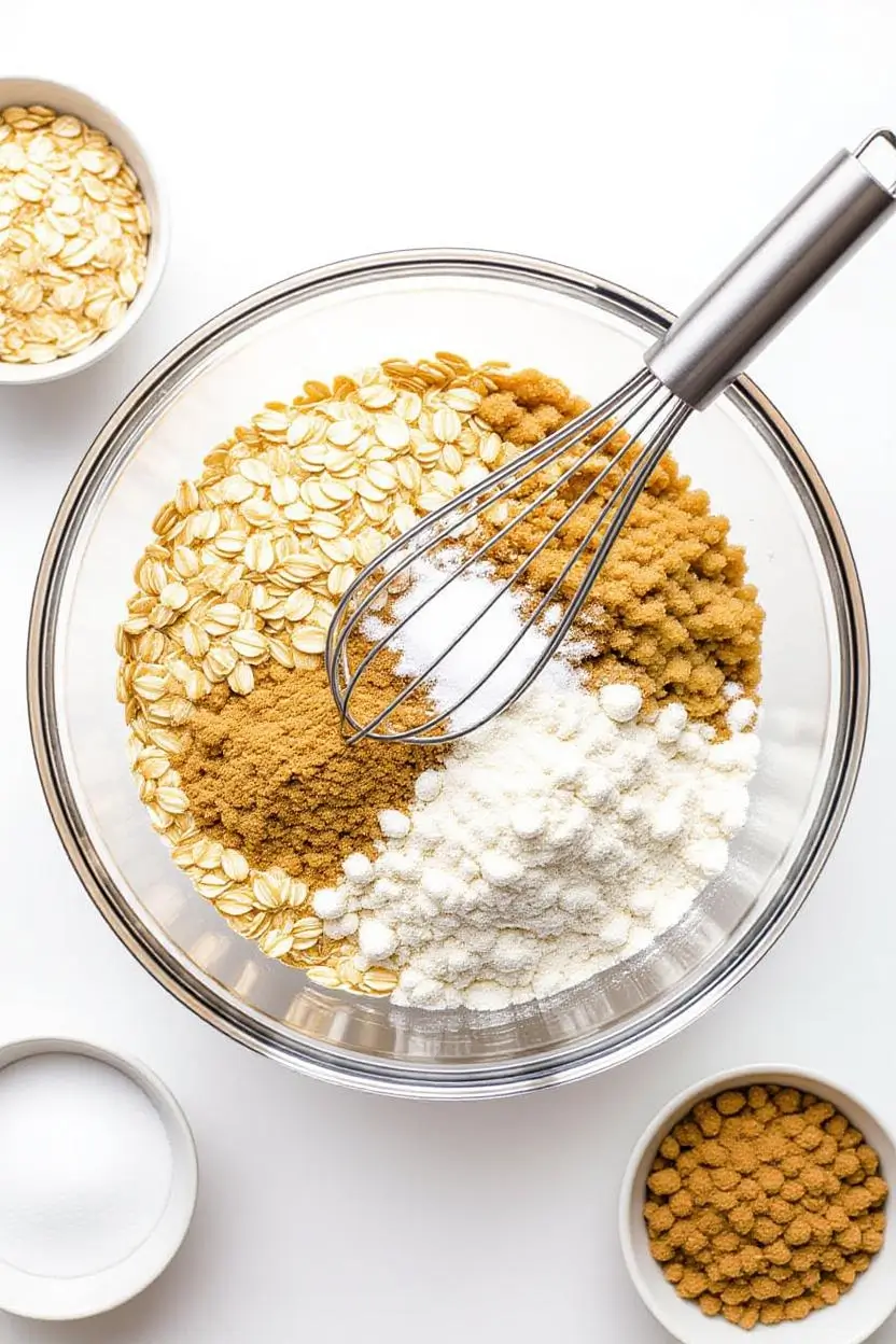 - In a large bowl, whisk together oats, flour, both sugars, baking soda, and salt until completely uniform—about 30 seconds of vigorous whisking. This ensures even distribution and prevents pockets of baking soda that can create metallic flavors.