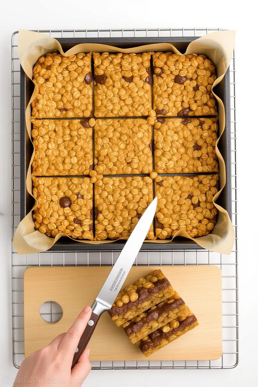 Use sharp knife wiped clean between cuts. For chocolate-topped bars, warm knife slightly under hot water and dry before cutting for cleanest edges.